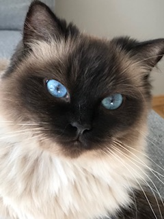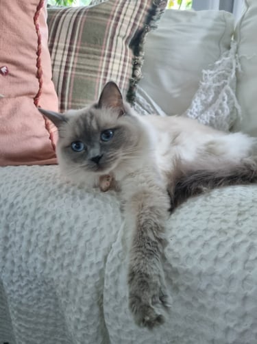 född 2023 är en riktig fullträff vad gäller inköpt avelshane! Han är SÅ otroligt social och "snackig" och peppar, peppar ingen okasterad hane som strilar inomhus. Han är väldigt fin mot sina honor och känner verkligen av när det är dags för parning utan att vara påträngande. Jag samäger honom med Josefin på Granqvisten's katteri och hon tog ett antal kullar med honom förra året med väldigt bra avkommor både vad gäller utseende och psyke. Förutom hans fantastiska ögon, så har han även den där lite kortare pälsen som jag gillar. Många ragdolls idag har ju väldigt mycket päls och det är tyvärr många som inte klarar av denna ganska jobbiga pälsvård som detta kräver.